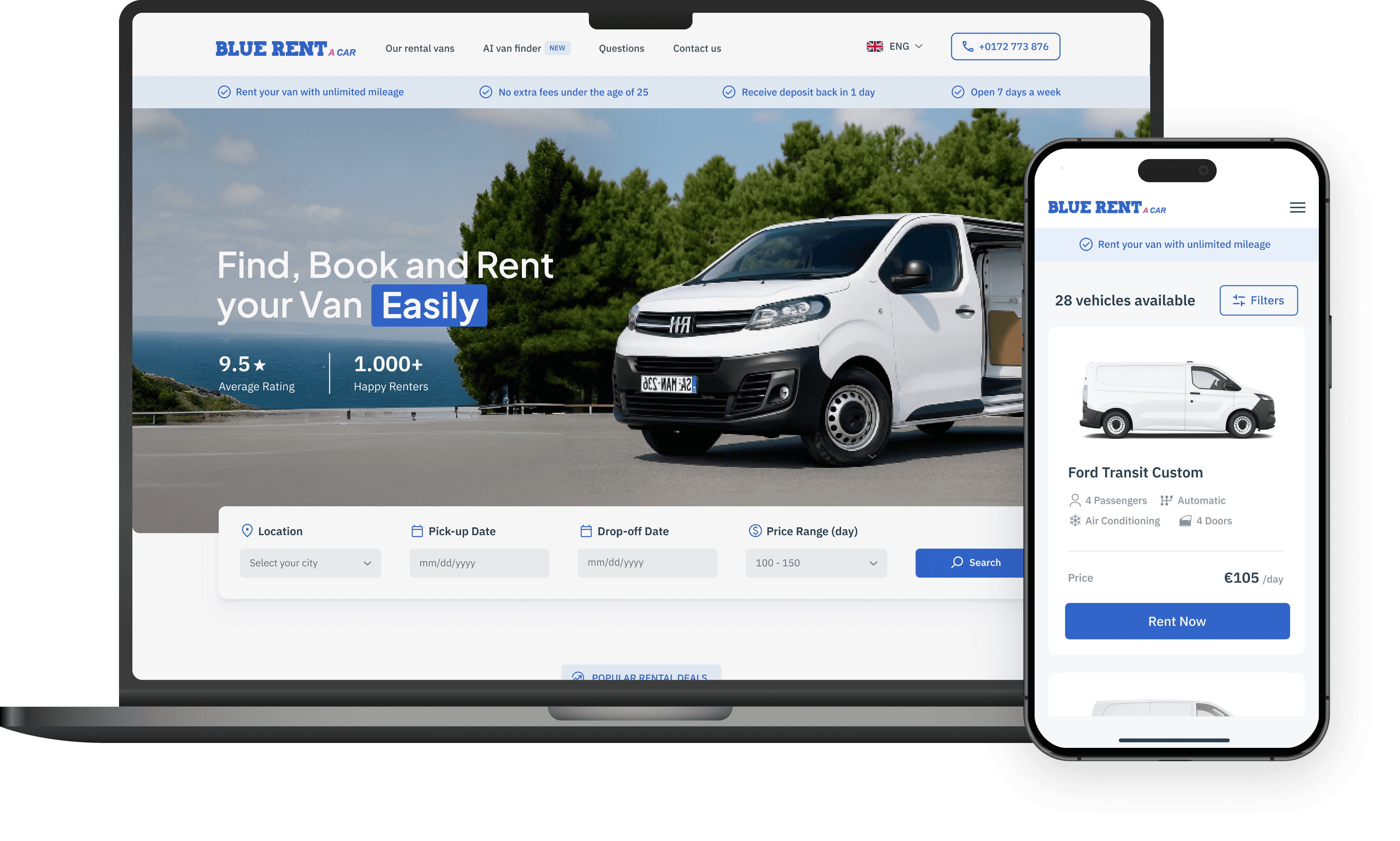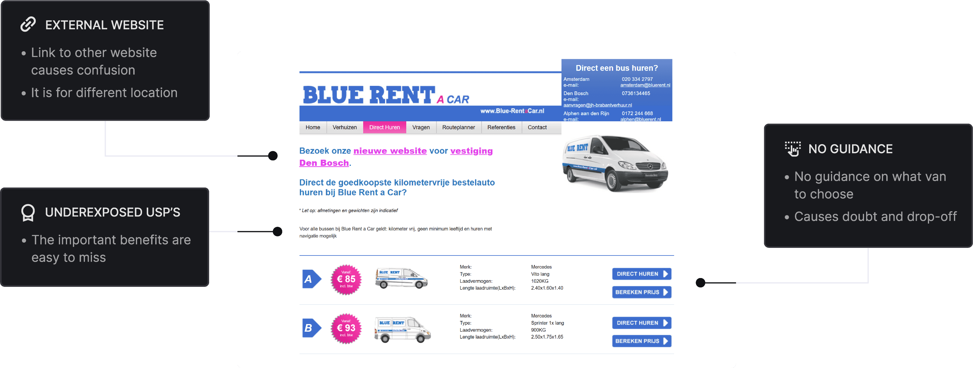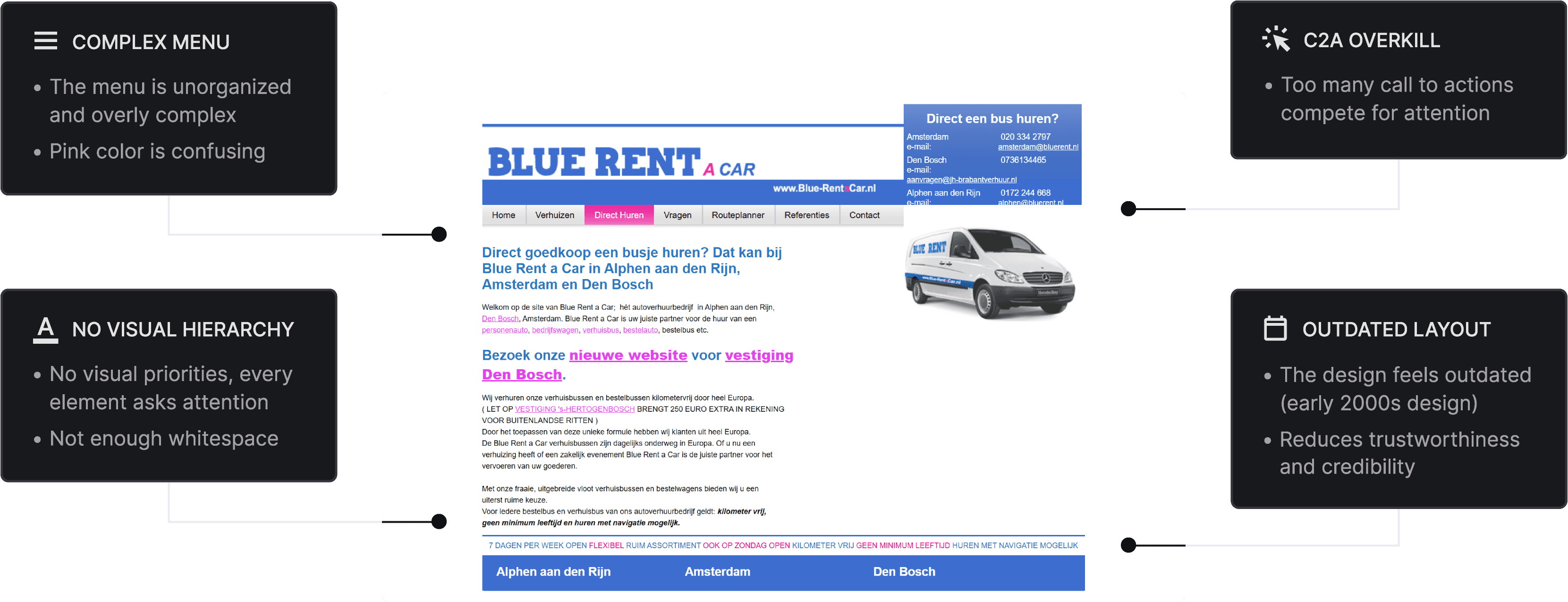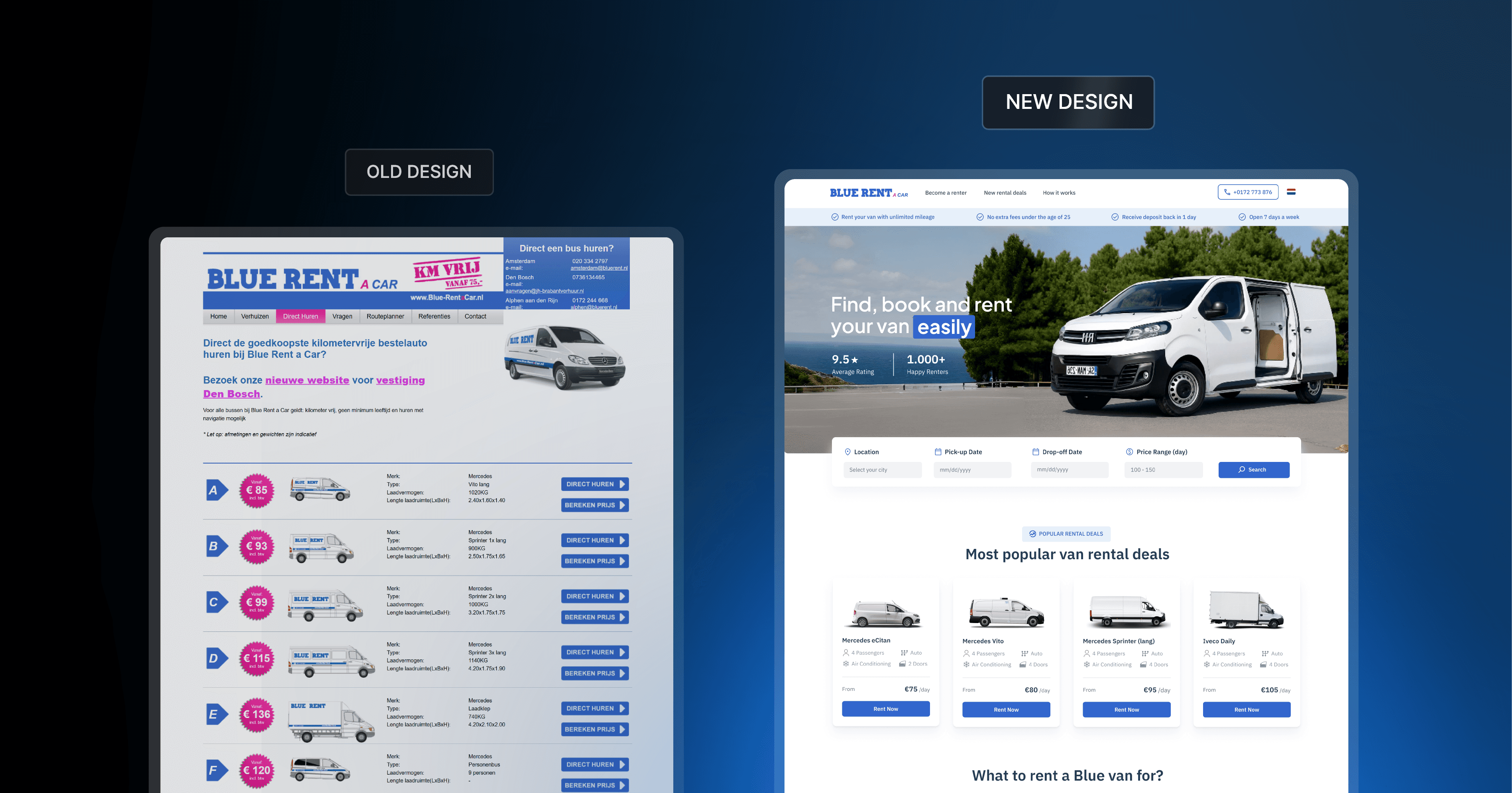 BlueRent is a van rental company based in Alphen aan den Rijn, where I live. Their service is excellent and the team is genuinely friendly. After their company was recently affected by a major fire, I decided to surprise them with a free website redesign.