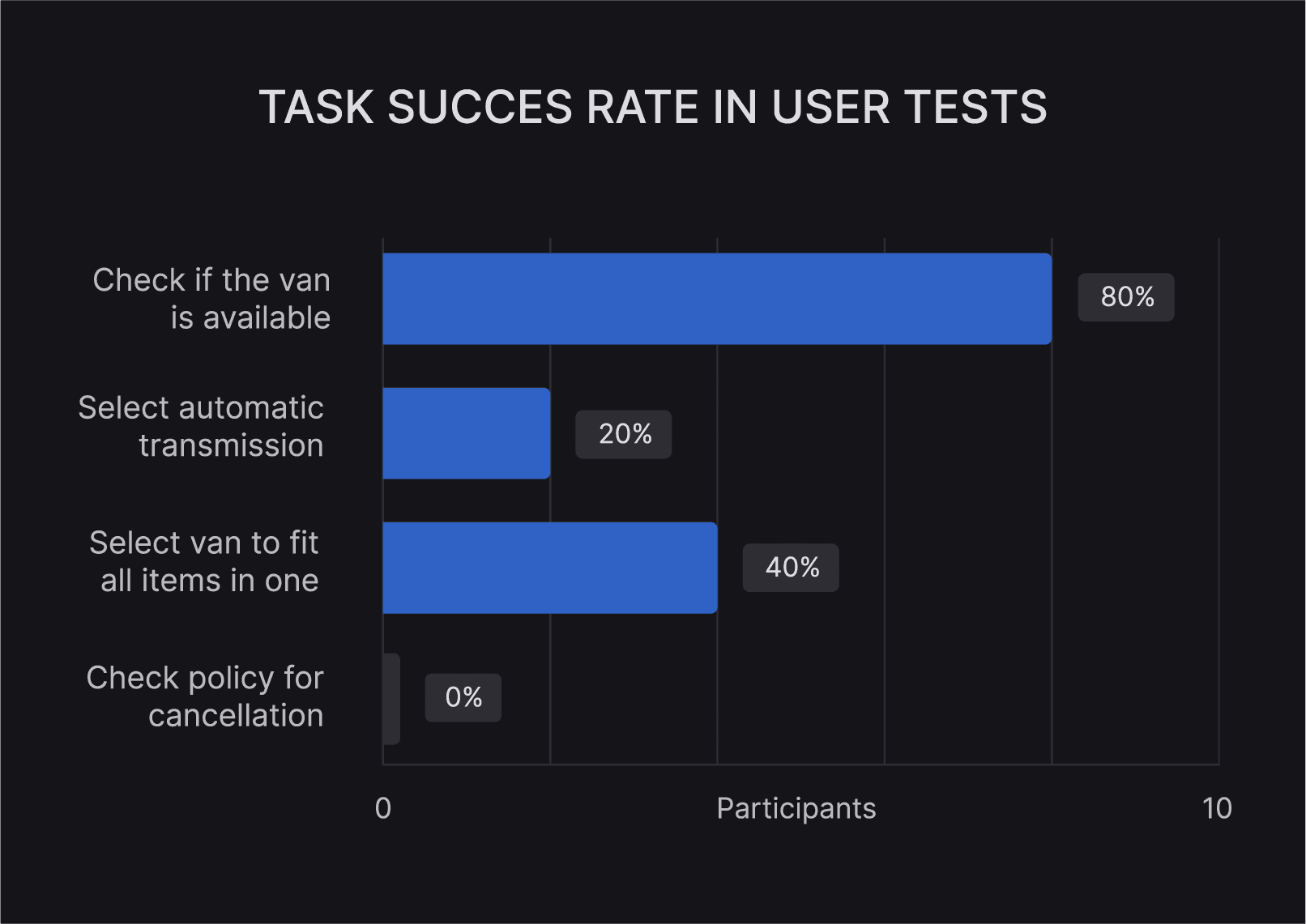 After the interviews, I asked participants to complete four tasks they would also typically perform when renting a van. I measured the success of the tasks by whether they could complete each action using the website only.